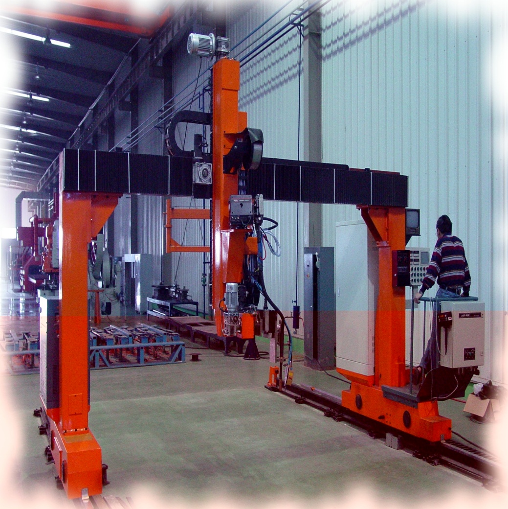 ● 龍門所配二臺焊機、保護氣氣瓶(至少2個)、控制柜等均放在龍門兩側托架上,隨龍門一起移動,進龍門的外部供電線纜采用滑線供給,使得龍門移動范圍加大。